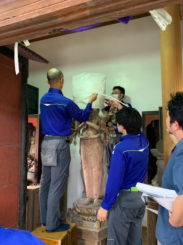 10月14日より浜松市美術館で開催される「みほとけのキセキⅡ ー遠州・三河のしられざる祈りー」へ展示するため、日本通運さんの美術品搬送グループによる千手観音像の搬出作業が行われました。