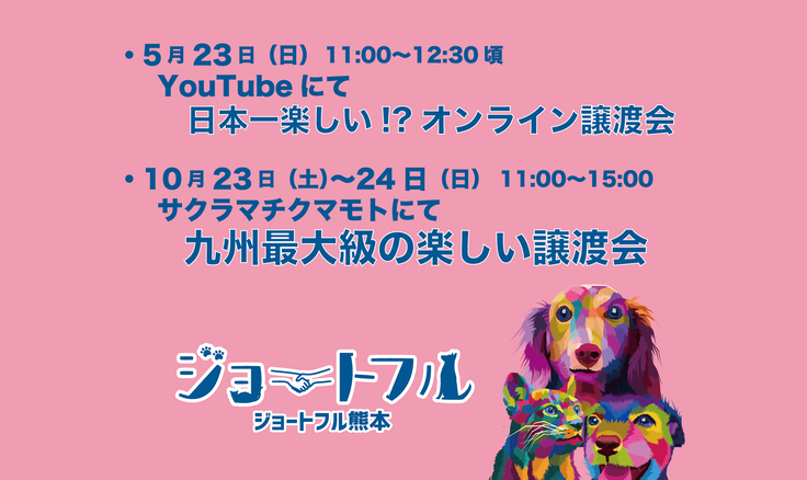 ◆ 「九州最大級の楽しい譲渡会」は、当初予定の5月から10月23日(土)〜10月24日(日)に日程変更してサクラマチクマモトにて開催します。