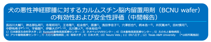 2025年5月28日現在,12症例の悪性グリオーマ(全例が高悪性度の希突起膠細胞腫)に対し,腫瘍切除後の切除腔へカルムスチン脳内留置用剤を留置しました.観察期間を術後1年としており,まだ半数例が観察期間中ですので最終的な成績は出ておりません.また現在10枚以上(5例前後で使用可能)の薬剤が残っておりますので,この先も適応症例が増えることも予想しております.先日の活動報告でもお知らせいたしましたが,クラウドファンディング上での終了期間を迎えるにあたり,中間報告として6月に開催されます第50回獣医神経病学会にてポスター発表をさせていただくこととしました.獣医神経病学会は獣医療関係者以外の一般の方は参加できませんので,リアルタイムで内容をご覧いただくことはできませんが,代わりといたしまして,その抄録とポスターをPDF化したものをリターンとしてお返しさせていただこうと思います(5万円以上の寄付者の方).しかしながら,リターンをお受けします皆様方にお願いがございます.今回中間発表として国内学会発表いたしますが,あくまで途中経過であり,最終成績は論文として国際誌に公表する予定となっております.それゆえ,今回の中間発表の内容について,インターネットやSNS等で公表しないよう,くれぐれもお願いいたします.