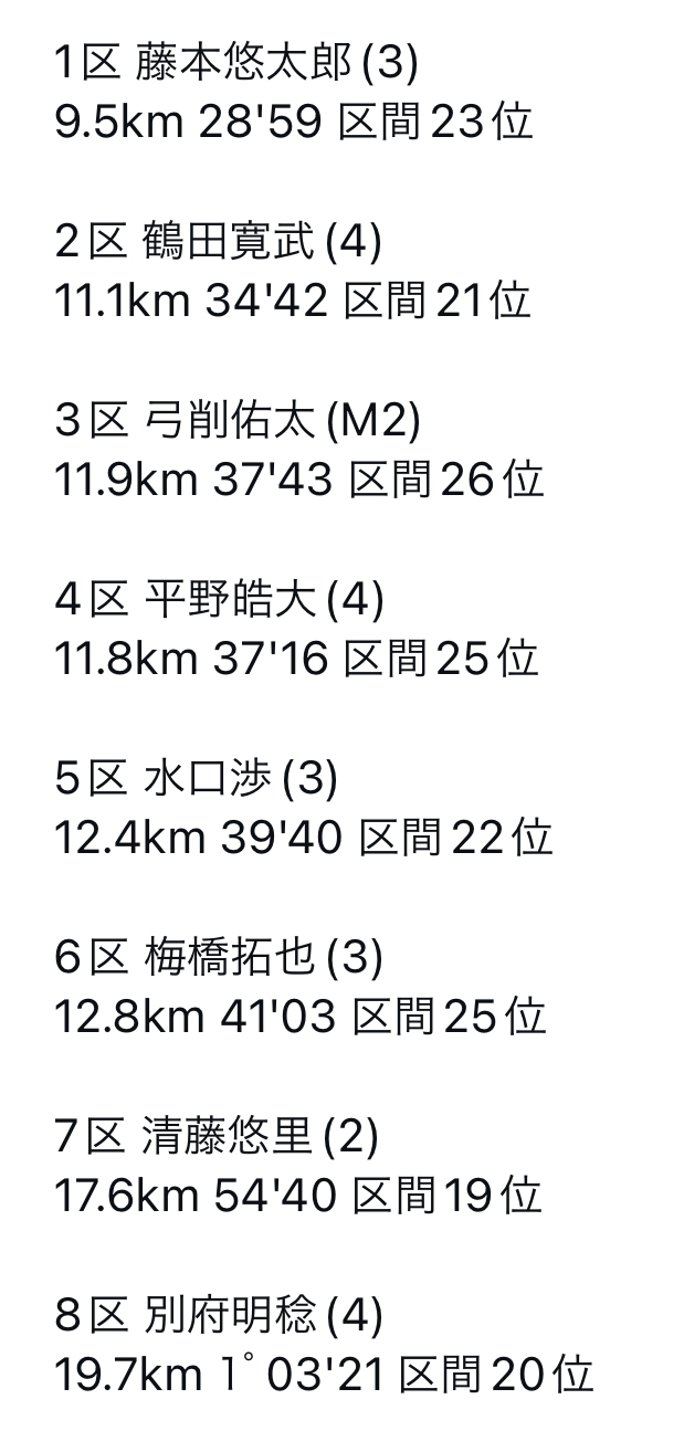 皆様いつも応援ありがとうございます。先日行われた「全日本大学駅伝」の結果を報告させていただきます。全日本大学駅伝とは、大学駅伝の最高峰に位置する駅伝大会であり、名古屋・熱田神宮から三重県・伊勢神宮までの106.8kmを8人で繋ぎます。全国8地区の代表25校と日本学連選抜・東海学連選抜の合計27チームが出場します。