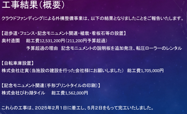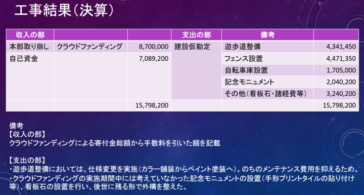 クラウドファンディングにより集まったお金は10,278,000円だったのですが、手数料の支払いを行った結果、8,700,000円が外構整備の原資となりました。