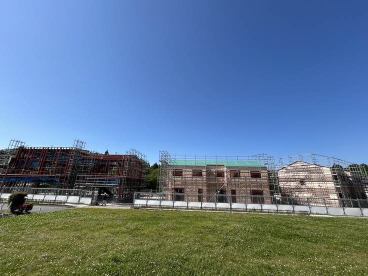 椿ホーム、柊ホームは窓やドアの形が見えてきて、だいぶ家らしくなってきました。子どもたちは、「こっち側の部屋がいいな!」などと新しいホームでの生活を想像し、楽しみにしている様子です。また職員はホームのキッチンやお風呂、床の色、家具やコンセントの配置など決めている段階です。私はこのような経験がなく、とても難しいですが職員同士で悩みながらたくさん話し合い、一つ一つ丁寧に進めています。これからの子どもたちが住む大事なお家のことで、作業に携わることができ、大変貴重な経験をさせていただいているなと実感しています。子ども、職員ともにワクワクしながら、新しい生活に向けて着々と準備を進めています。