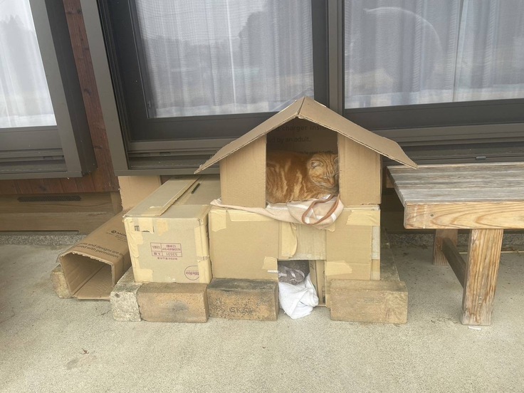 のがルーティンとなっているようです。毎日来てくれるもんですから、中学生がお家をつくっていました。雪の日には湯たんぽを用意してお家の中に入れています。また面白いのが、子どもが怒っている時に猫の元へ行って撫でながら癒されている様子も見かけます。ただ可愛いだけでなく、優しい猫さんに私達も癒され、少し頼っているのかもしれません。動物を想う行動や優しさを見ていると、私達も何かホッとするものがあります。