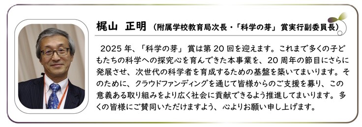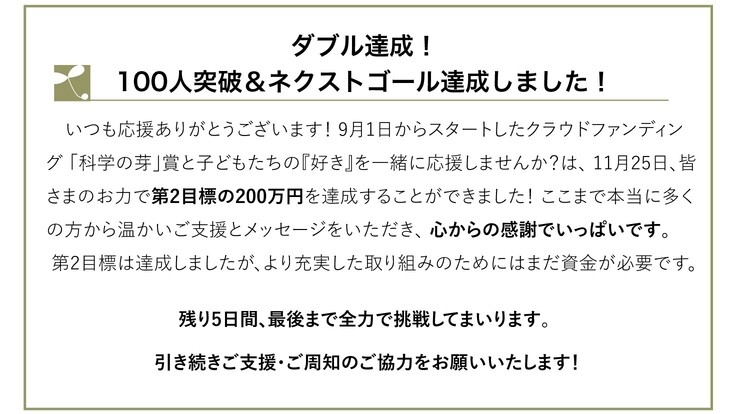 「科学の芽」賞と、子どもたちの「好き」を応援する輪を、もっと広げていきたいと思います。最終日まで、皆さまのご支援・ご協力、そして周囲へのご周知をどうぞよろしくお願いいたします。