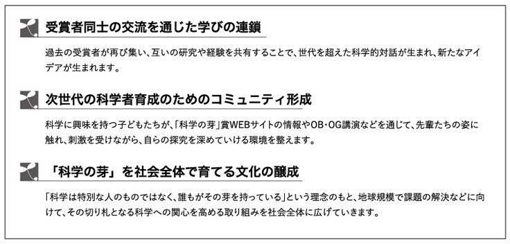 「科学の芽」賞は、応募や受賞がゴールではありません。これをきっかけに、科学への興味・関心を深め、探究心を育む場を継続的に提供することが私たちの願いです。受賞者や応募者がその後も成長し続けられるよう、コミュニティの力を活かして支えていきます。