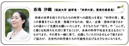 - 呑海沙織(筑波大学 朝永振一郎記念「科学の芽」賞実行委員会委員長)