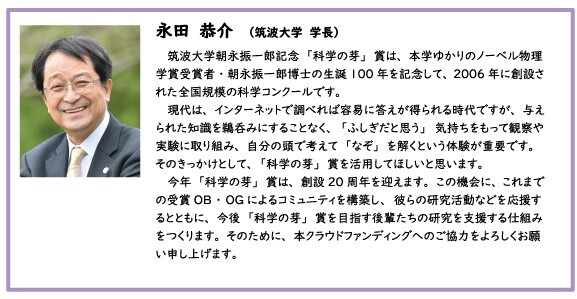 日本には、科学の研究レポートを応募できるコンクールがたくさんあります。その中で、筑波大学の「科学の芽」賞は、子どもたちが日常生活の中で、あるいは自然に触れたときなどに感じる「ふしぎだと思うこと」から始まる探究を大切にしています。「科学の芽」賞は今年20周年を迎え、ここから巣立ったOB・OGは、科学・技術を含む様々な分野で活躍を始めています。このOB・OGによるコミュニティを構築し、これから「科学の芽」賞を目指す子どもたちの応援団をつくるため、皆さまのご支援をお願い致します。