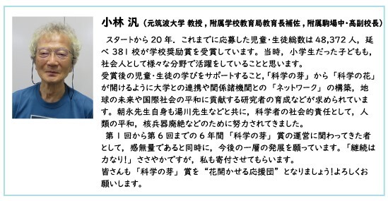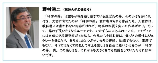 本コンクールは、今年で20周年を迎えます。これまでに延べ40,440件の応募があり、最高賞である「科学の芽」賞は368作品に授与されました。受賞者の中には、科学・技術に関わる分野に進み、研究・開発の現場で才能を発揮している方々も多く、「科学の芽」賞は、未来の科学者を育てる場としても成果を上げています。