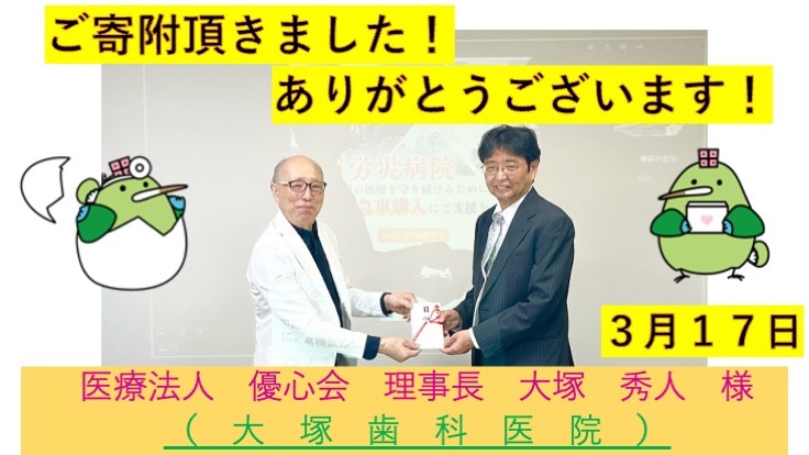 医療法人優心会理事長 大塚秀人様(大塚歯科医院)より温かいご寄付をいただきました!