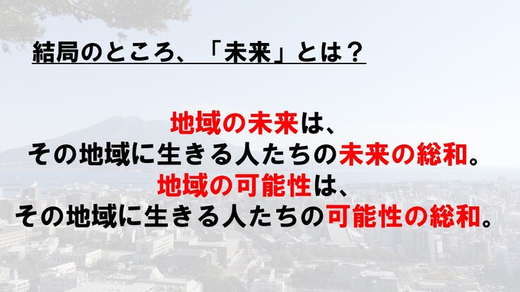 また、2020年1月「東南アジア青年の船」事業の報告会を鹿児島大学で開催した際には、同じく2つのキーワードから鹿児島の未来を描いて、「そもそも地域の未来とは」という内容で以下のようにプレゼンをしています。