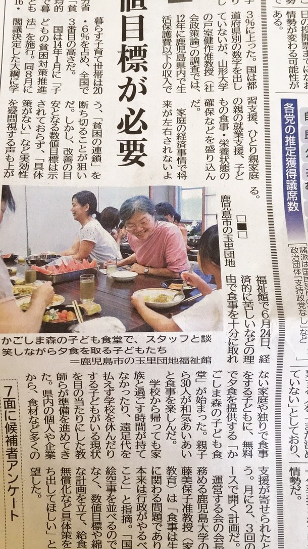 初めまして、鹿児島県で森の玉里子ども食堂の代表をしている齋藤です。私自身は家庭科教育が専門で、生活者の視点に立った研究をしてきました。今年に入り、「急増している子どもの貧困率が社会の問題として取り上げられるようになってきた中で「子ども食堂」の取組を知りました。ぜひ立ち上げたい。」という熱心な教員から依頼され、一緒に鹿児島にも子ども食堂を作ろうと取り組むことになりました。