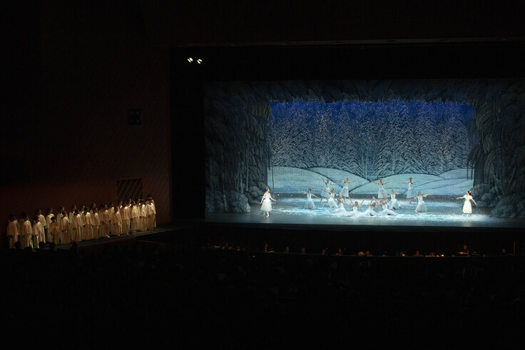 合唱隊がバレエの物語を目の前に、オーケストラの生演奏の中で合唱し、