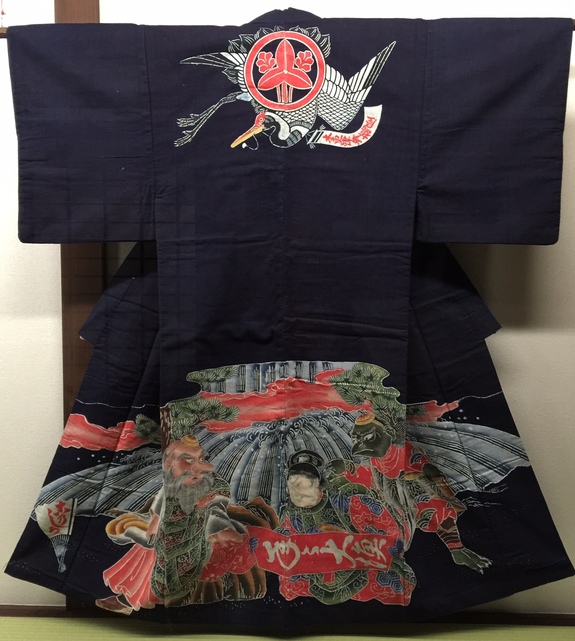 この万祝は、天狗と若武者。左の扇子にはこのしろ、中央の旗の赤地に白抜きの文字は年々大漁とあります。