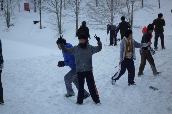 (12月の花山青少年自然の家にての雪遊びの写真です。勉強のための合宿でしたが、この雪とこの天候では、それどころではありませんでした。みんなすごく楽しんでいます!)
