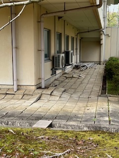 校舎の至ることに亀裂が入り、地面(床)が隆起している箇所が目立ち、カラーコーンで立ち入りが禁止されている箇所が無数にありました。中でも、水道管の破損位置が特定できないことで、水道の復旧がいつになるか分からず、寮で暮らす学生さん達は非常に苦労している状況があるとのことでした。仮に校舎や水道管の修繕を行うにしても、全てに補助金が出たり、保険が使われるということではないので、安全を確保できる最低限の計画を立て、少しずつ自分たちの手で復旧を行っているとのことです。「笑顔を共有する」「肩を並べて共に歩みを進める」そんないかにも介護職が口にしそうなスローガンを掲げ、現地に入った我々でしたが、現地の状況を目の当たりにし、被災地支援の重みを改めて知ることになりました。