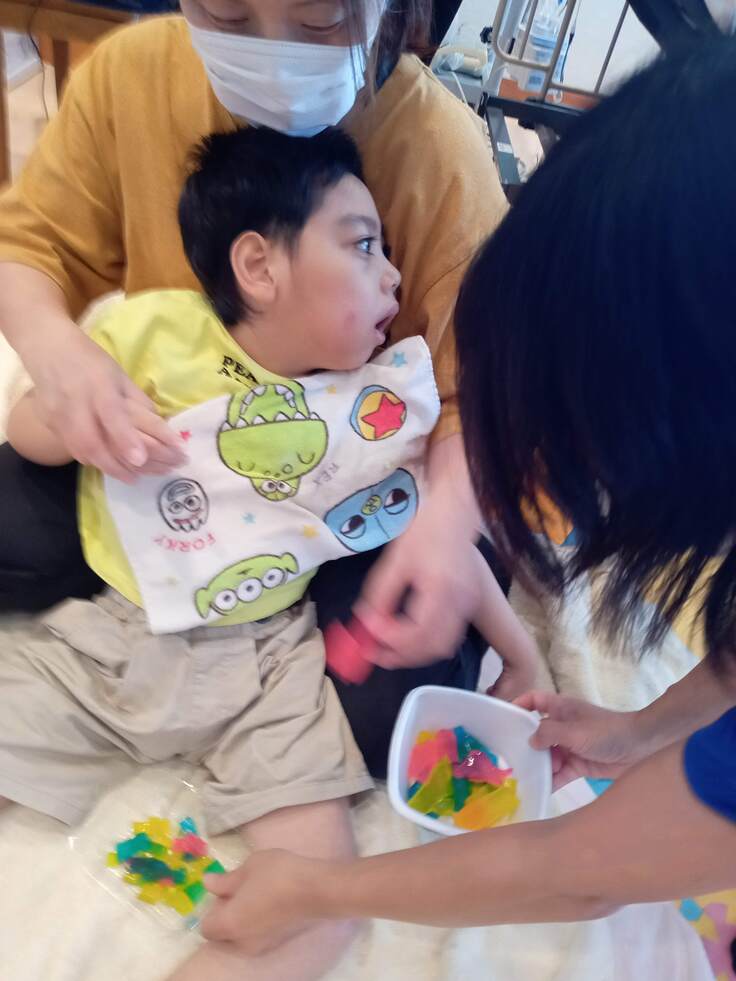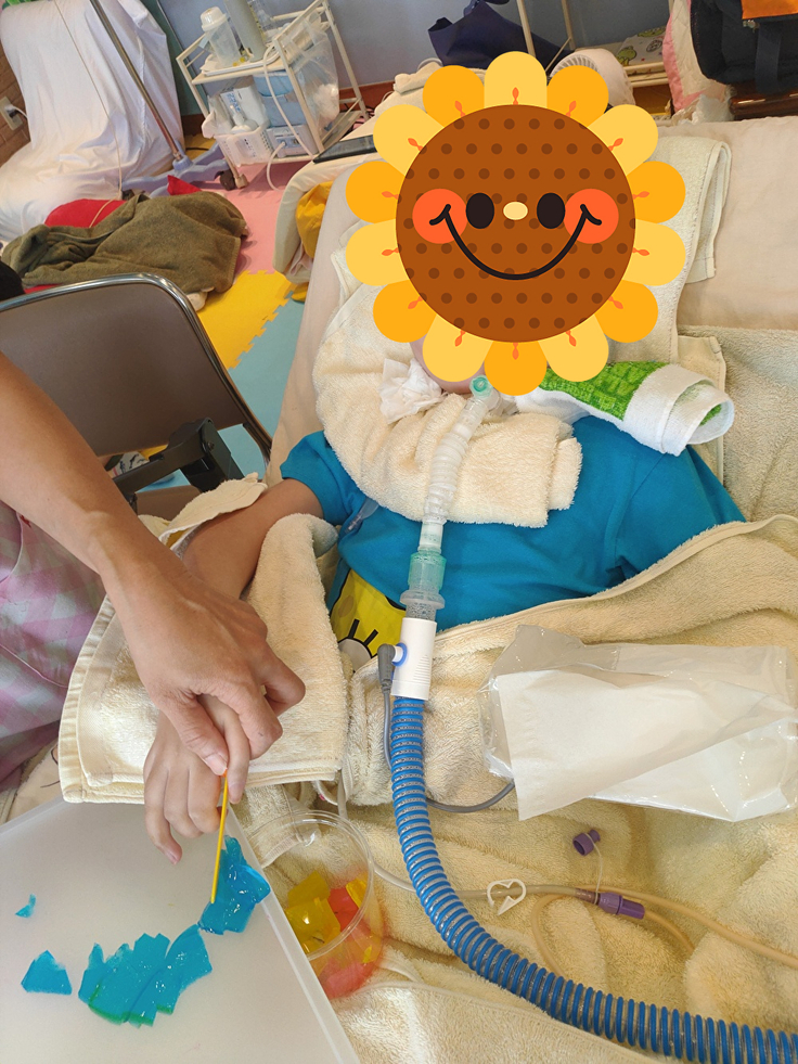 寒天特有の不思議な感触を素手で触ったり、おもちゃの包丁で切ったりして楽しんでいます!