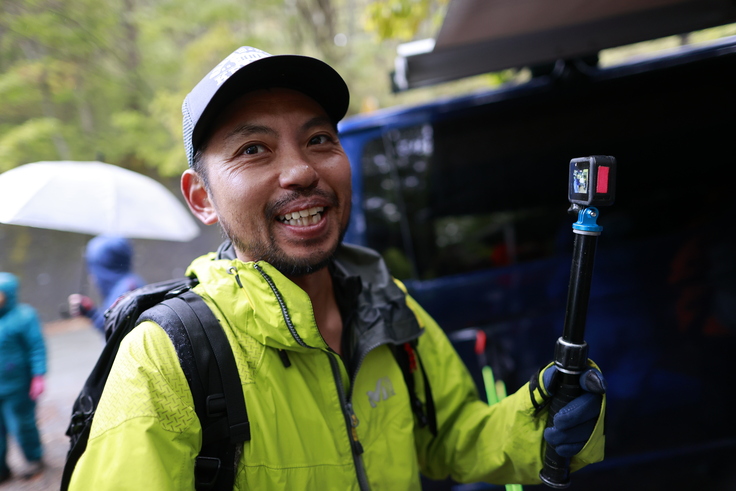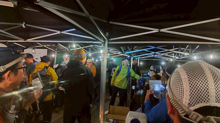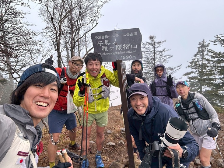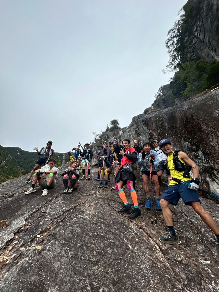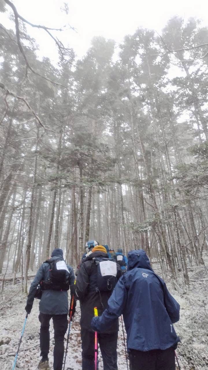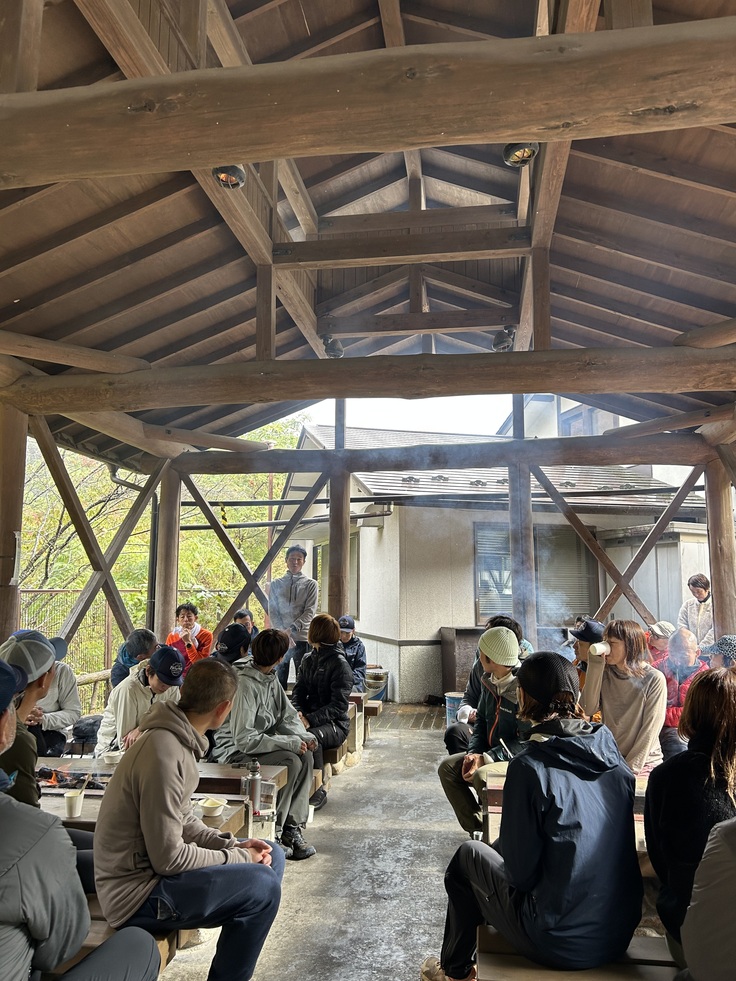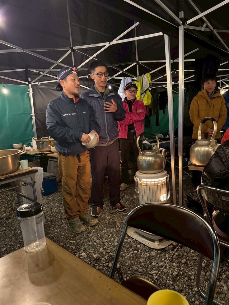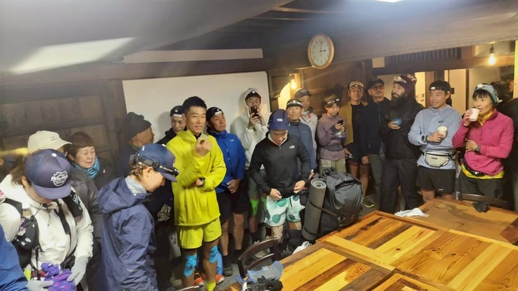 明るければ原生林がよい雰囲気です。雨でも味がある山です。という意味ではいつ行っても最高な山、それが櫛形山です。最後はミネバリ尾根というかつて岩園館へ下る道として使われていた長い尾根を下ります。ミネバリ尾根の名前の由来は、甲斐国ロングトレイルブック内に答えが書かれています。2年前は石ゴロゴロ、倒木、落ち葉で何度も転びながら下りました。今回は何度かお掃除に入り、しかも当日には白鳳会の亀田理事長が6時間もかけて落ち葉はきをしながら登ってきてくれて、アヤメ平の上の分岐で最終グループが来るまで待っていてくれました。とても安心しました。ミネバリのルートは明瞭で、とてもスムーズに下ることができました。途中に会員の鎌田さん、初日もサポートしていただいた井出さん(井出石材店)も真っ暗な中最後尾グループを待ってくれていました。最後はみんなでトレインで下り、おかげでキャンプ地である金山沢温泉の露天風呂は大盛り上がりでした。入浴時間を延長していただき感謝いたします。夕食は三八商店さんによる、うどんです。これがまたつるつる入っていき美味しくてたまりません。はくばくさんから提供いただいた、「はい千番うどん」は50人分あっという間に終わってしまいました。行程は厳しかったですが、最高の一日を過ごしました。