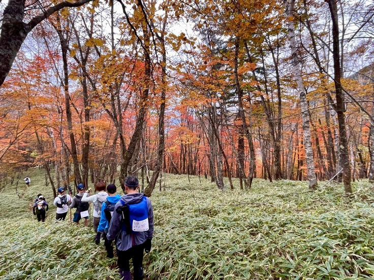 このルートは富士山と南アルプスを見ることができるのですが、見えなくても楽しく歩けるルートです。ルート自体に迫力があり、おまけに参加者同士のつながりが深くなり始めてくる時で、一緒に歩いているだけで楽しめるのです。標高1700m付近を歩く時間が長く、紅葉がとてもきれいでたびたび歓声が沸き上がっていました。