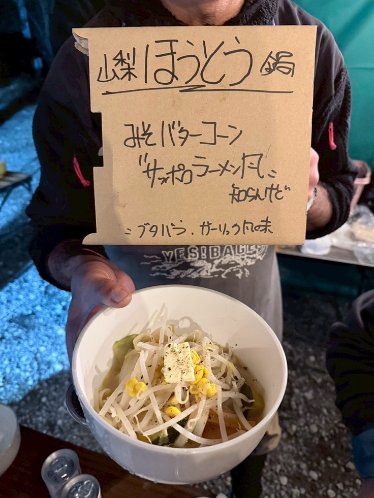 笹子エイドでは桜森林公園で終了するグループと、そこからさらに御坂山地に登り上げるグループとに分かれました。笹子組は、キャンプへ戻る途中、みさかの湯に立ち寄り、疲れをいやしました。御坂組は最後までがんばり通し、キャンプ地では到着をみんなで迎えました。あの盛り上がりは忘れません。イエスベーグルさんによるせんべい汁とみそバタほうとうもこれまた極上のテイストでした。美味しかったです。ほうとうは、地元はくばくさんより、「あばれほうとう」を提供いただきました。