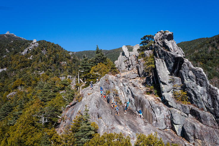 そこをまずは自分の仲のよい選手の中で、ロングトレイルがとても好きであろうメンバーに声をかけてみました。15名ほどが集まり、みんなで280㎞を5日間かけてぐるりとしたのです。2020年と違うところは、夜しっかりご飯を食べて、温泉があるところでは入り、しっかり寝る、こと。これが、最高によくて、幸福感に包まれたわけです。みんなでひたすら走って歩いて、しゃべって、食べて、お風呂入って、寝る。これ以外は何もありません。その空間を全力で楽しむだけの5日間。まさにトレイル旅行とでもいいましょうか。体よりも喉がまず痛くなります(笑)。私自身こんな経験をしたことなかったです。長い日では、朝4時から夜9時までひたすらみんなで歩く。圧倒的な景色と、普段会えない仲間との会話により17時間行動も気になりませんでした。終わってほしくない時間でしたね。