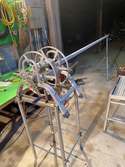 経費削減の為に自作加工した被覆材巻取器(左)と散布用動噴(右)