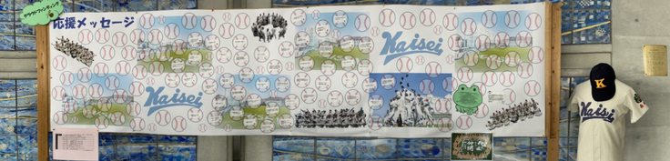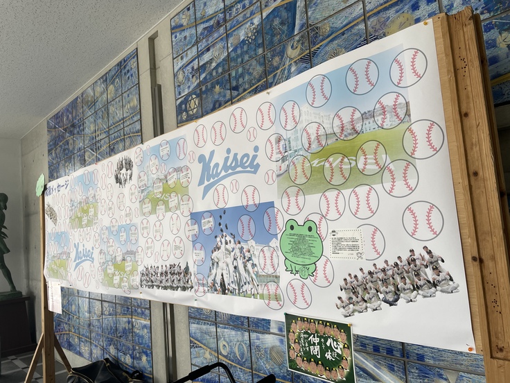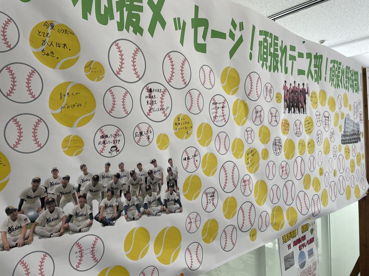下の写真は校内の応援メッセージの掲示板の写真です。たくさんのメッセージをいただいています。ありがとうございます。また野球部と同時期にテニスのセンバツ大会も福岡県で開催されています。海星の生徒から選手にむけて応援メッセージを書く掲示板も設置しています。
