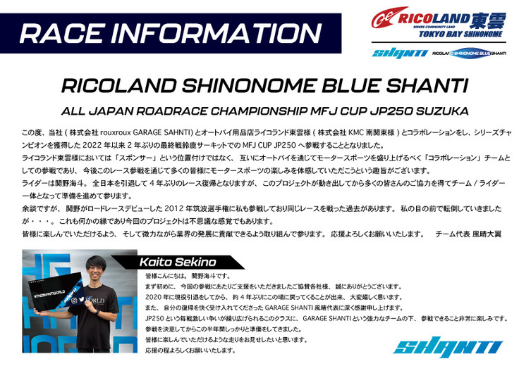 全日本ロードレース選手権 最終戦鈴鹿 MFJ CUP JP250クラスに"RICOLAND SHINONOME BLUE SHANTI"より参戦することが正式に決定いたしました。