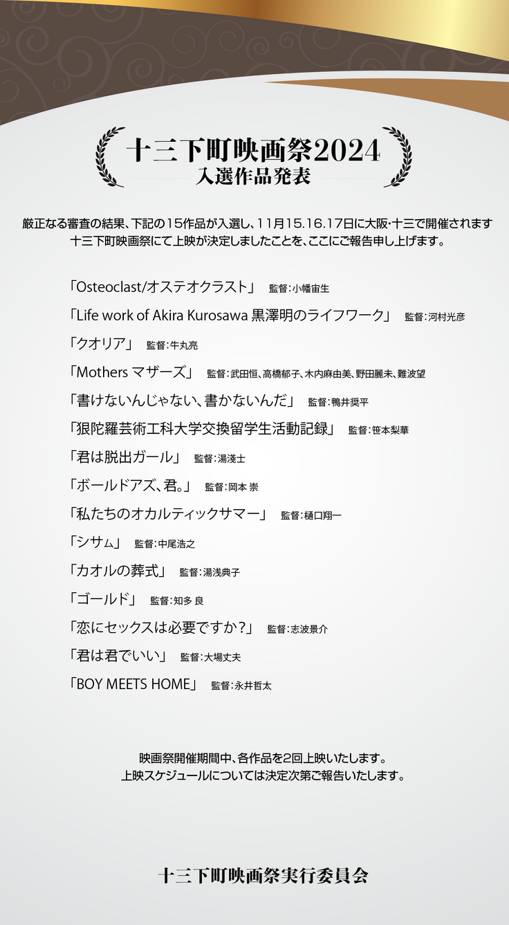 本作品が、十三下町映画祭2024の入選作品に選出されました!
