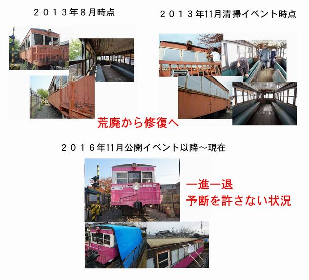 現在まで素人集団ではなんとか劣化の食い止めや応急の保護が精いっぱいの状況なのです。何とか皆様のお力添えで地元加古川の地へ未来へキハ2号を残させてください。