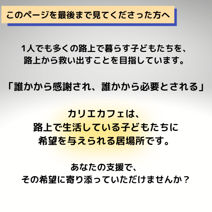 「将来、カリエの皆のように路上で生活している子どもたちに希望を与えられる存在になりたい」、そんな事を想ってくれる若者が巣立ってくれる事を望んでいます。