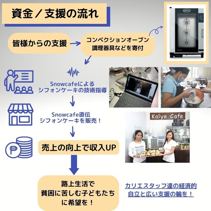 ■目標金額:350万円 ■目標金額の使途および実施内容:カリエカフェの自立に向けて次の用途に使わせて頂きます。オーブン:230万円、冷蔵庫:35万円、製菓道具:22万円、シフォンケーキ講師渡航費:17万円、クラウドファンディング手数料:46万円