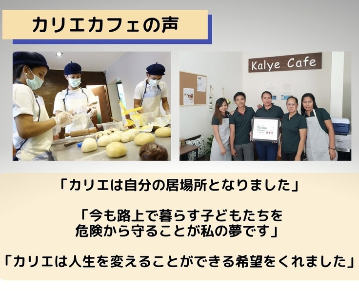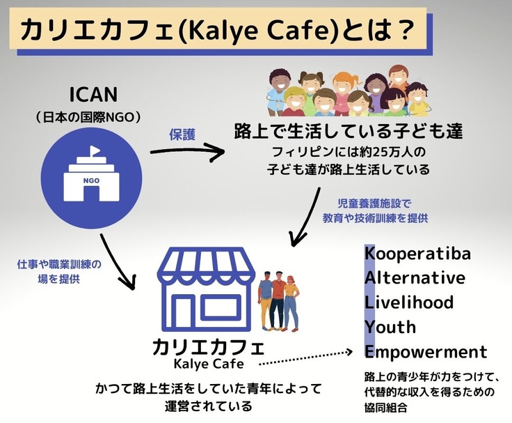 日本の国際協力NGOであるアイキャンの技術支援を受けて、フィリピンマニラ市内でカリエカフェが誕生しました。カリエカフェは、路上の子ども・若者たちが危険な労働をせず、収入を得て、生計を立てていく社会起業の活動です。