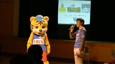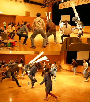 イベントのフィナーレはメインホールにて「金津流獅子躍」の体験。「ざん、たくずぐ たぐずぐ たぐずぐ たっこ、ざん」。「ざん」で体を反転させて頭を突っ込む!