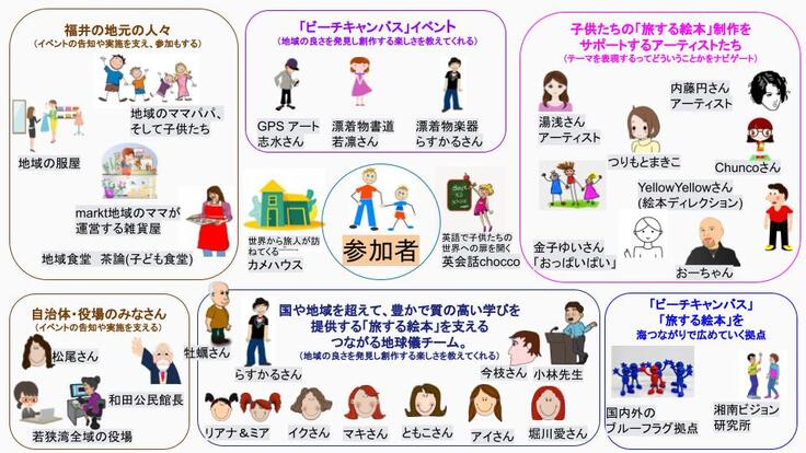 30都道府県以上の方にでコミュニティをつくるキッカケとなる「旅する絵本グループ」に参画いただき、そのために、若狭湾の取り組みのノウハウを共有させていただき、世界中の仲間と情報交換しながら、絵本作りを中心とした子どもの子育てに取り組んでいただけます。