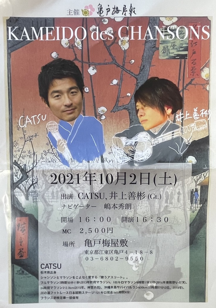 *2日(土曜)KAMEIDO des CHANSONS(出演:CATSU,井上善彬・ナビゲーター:嶋本秀朗) 開場 :16:00 開演:16:30 MC 2,500円