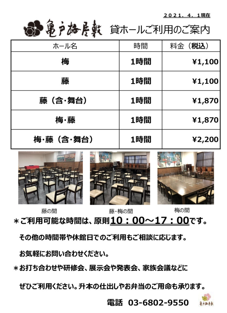 亀戸梅屋敷におきましても、当面はホールでのイベントなどは定員の7割(70人)を上限でお願いしています。