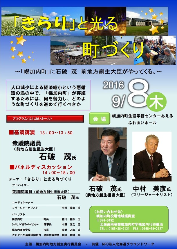 幌加内町で開催されたシンポジウム、「『きらり』と光る町づくり」にゲストとして石破様が招かれ、基調講演などが行われました。