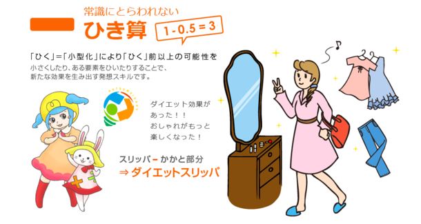 発明楽の4つの発想スキルとは、子ども達にも理解しやすいように考え方をたし算・ひき算・かけ算・わり算で整理したものです。具体例を挙げてご説明します。