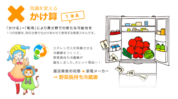 発明とは、常識を超える➀たし算②ひき算③かけ算(転用)④わり算(逆転)の発想スキルから生まれています。