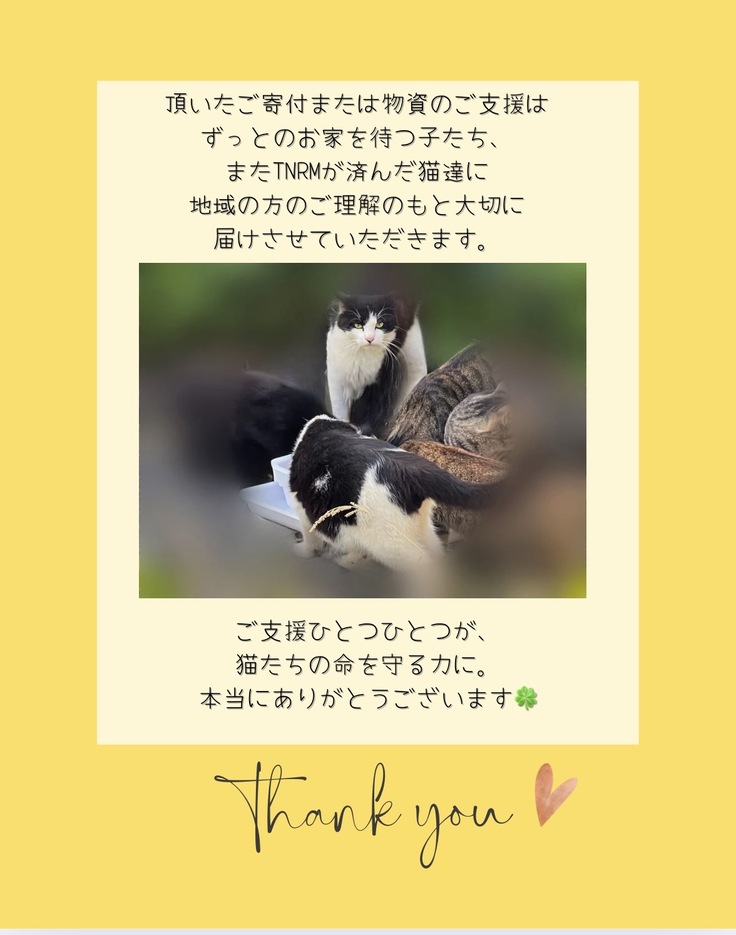 地域猫や保護猫たちのご飯・医療費・TNRM活動に大切に使わせていただいています。