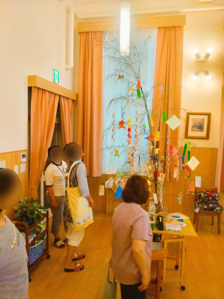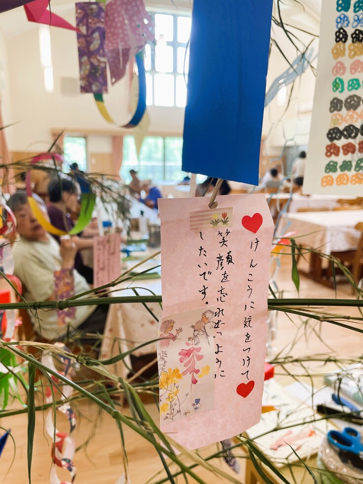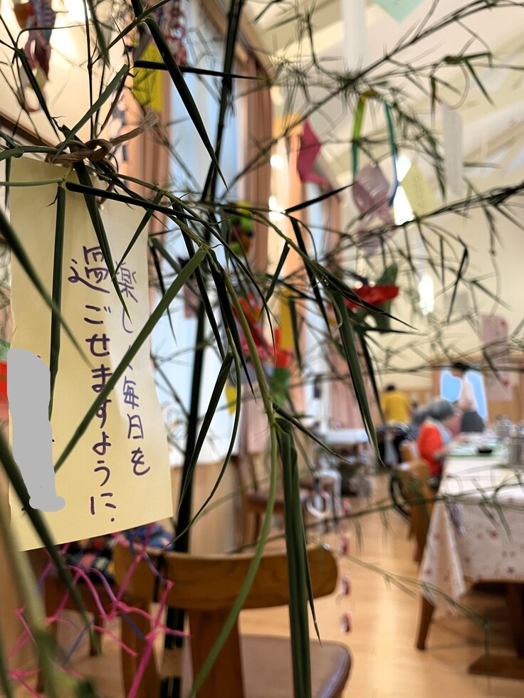 かにたでも数日前から食堂に竹を用意して、利用者のみなさんや職員に短冊や飾りつけをしていただきました。