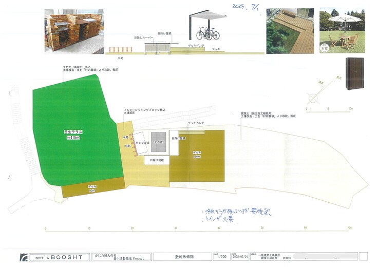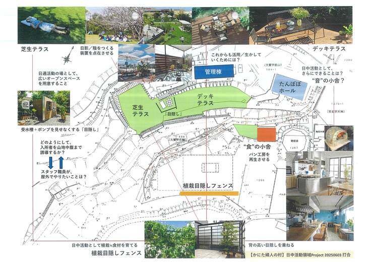 もともと建設を予定していた場所は、建物を建てるのは難しいとはいえ、新居住棟からほどよい距離に広大なスペースがあるので、こちらも有効活用していきたいと考えています。今、出ているプランは、芝生広場やデッキ、大掛かりでない日除けスペース、野外炊事ができる設備などを整備して、生活空間から少し離れた場所に利用者も職員もホッと一息つけるようなスペースを整備する、というものです。もちろん今回のクラファンの目的である「食の舎」の整備が第一ですが、もし集まった資金の余剰が出た場合には、この「憩いのスペース」の整備にも充てさせていただきたいと考えています。