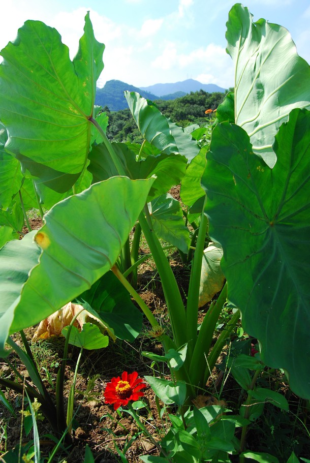 里芋の傘にできそうな大きな葉に、「ころ~ん。ころころ」と宝石が転がります。