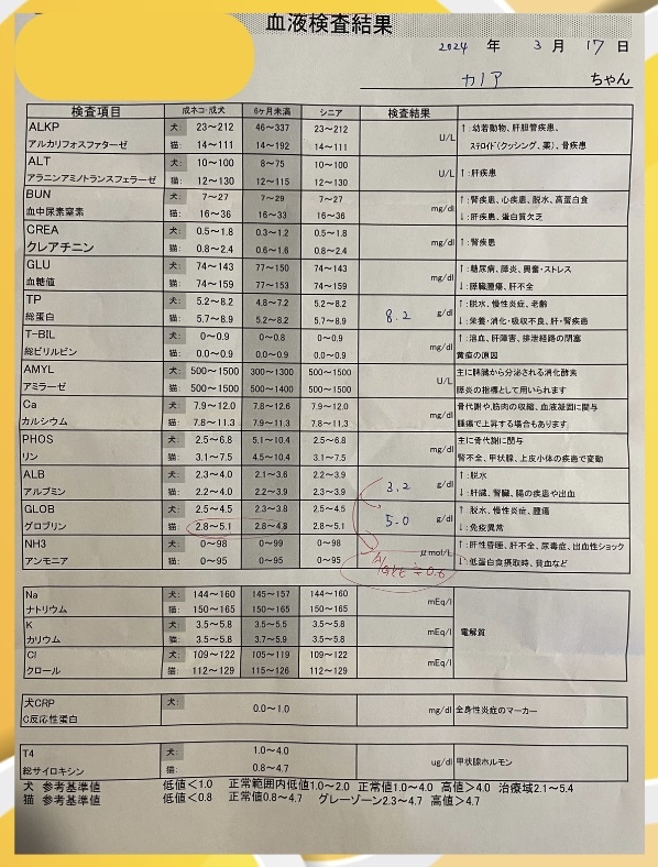 検査結果は、ほぼ良好でしたアルブミンとグロブリンの比率をAG比と呼ぶそうです。