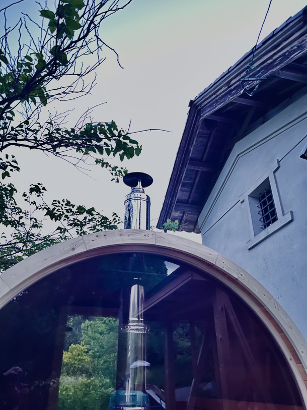 神音の周囲の緑や、築100年の蔵とも不思議な位溶け込んで共存しつつ、丸いフォルムが独特の存在感。