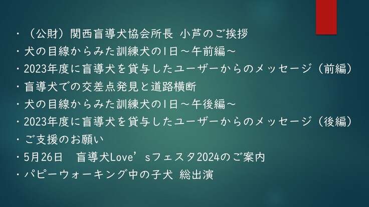 訓練の様子や、昨年度盲導犬を貸与したユーザーからのメッセージなど、盲導犬のことやユーザーのことをより深く知っていただける内容となっています。