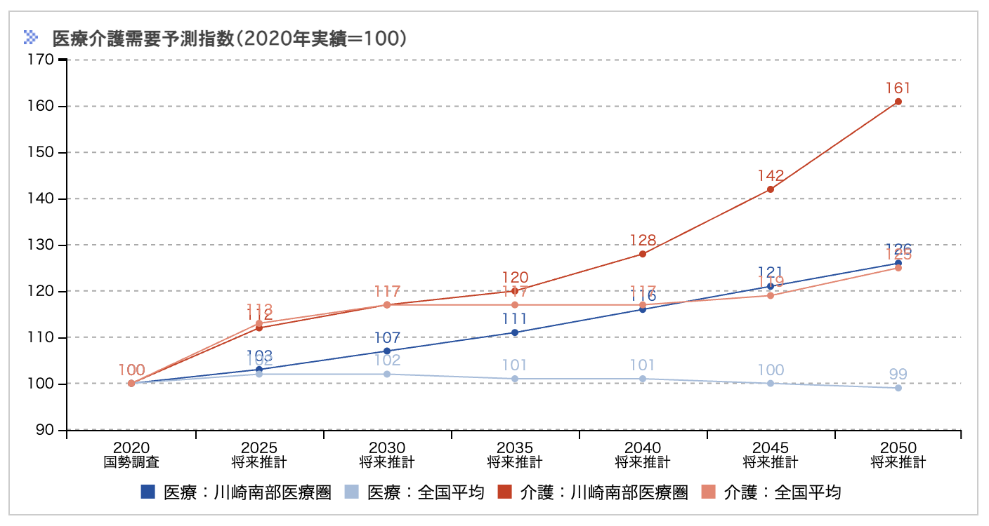 当院がある川崎南部医療圏でも、特に65歳以上の高齢者人口の増加などにより、医療や手術に対するニーズも増加していくことが見込まれています(図1参照)。