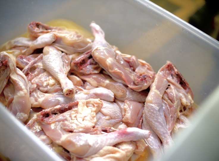 計算尽くされた下漬け用の塩ダレは、鶏肉と同じ浸透圧のため、鶏肉の中の余分の水分、血液を排出し、鶏肉の中に染み込みます。
