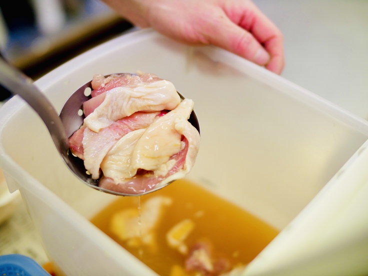「からあげショップきづ」の唐揚げ塩味は、表面に味をつけるのではなく、浸透圧を利用して、お肉の中にタレを染み込ませています。