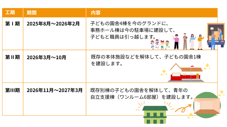 建替の工期は2025(令和7)年8月~2027(令和9)年3月になります。工期は3期に分かれています。